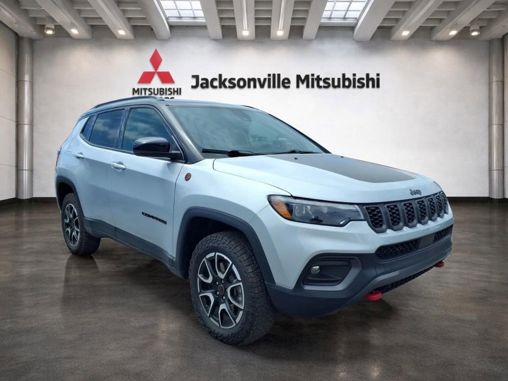Experience rugged refinement with this 2025 Jeep Compass Trailhawk, located in Jacksonville, NC. With only 26,686 miles, this low-mileage Trailhawk delivers trail-ready capability and modern tech in a compact SUV that's built to go farther. Powered by a confident 2.0L 4-cylinder gasoline engine and equipped with 4WD, it's ready for weekend escapes, coastal roads, and daily drives with composed handling and true off-road pedigree. This Jeep Compass Trailhawk comes with a CARFAX Clean Report, giving you added peace of mind about its history. Step inside to find a well-appointed cabin featuring Apple CarPlay and Android Auto for seamless smartphone integration-stream your music, navigate, and make hands-free calls with ease. Remote Start adds convenience during chilly mornings or hot afternoons, letting you warm up or cool down the interior before you hop in. Adaptive Cruise Control enhances highway comfort and safety by maintaining a set distance from traffic, reducing driver fatigue on longer trips. The Trailhawk trim brings distinctive styling cues and rugged touches that set it apart, including durable exterior accents and a confident stance that hints at its capability. Whether you're navigating suburban streets or exploring dirt roads outside Jacksonville, NC, this 2025 Jeep Compass Trailhawk combines modern conveniences, verified history, and low mileage to deliver a versatile, adventure-ready SUV. Schedule a viewing or test drive today and see how well-equipped this Jeep Compass fits your lifestyle.